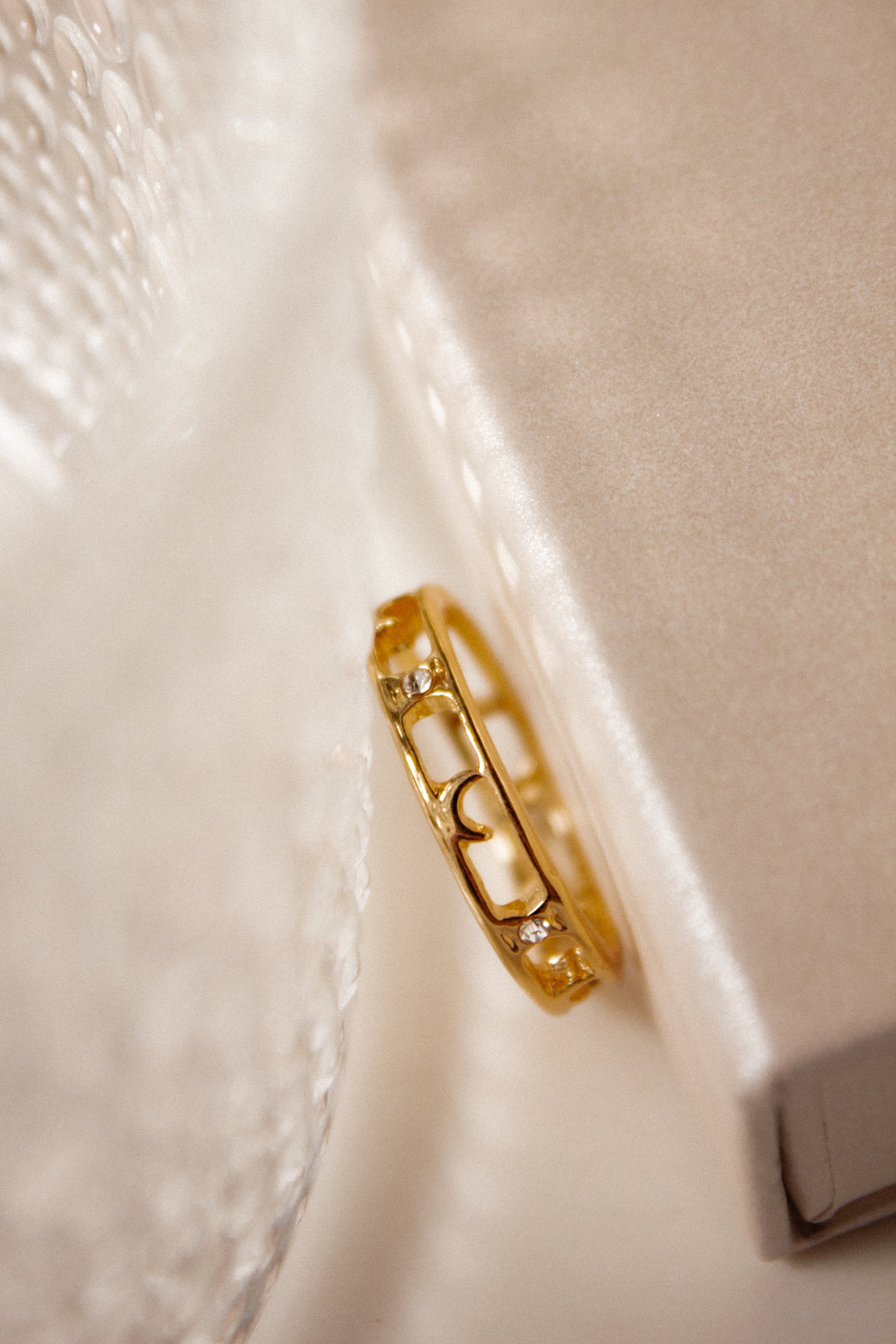 Estilo de sortija minimalista y delicado con diseños de luna y estrellas en su centro.